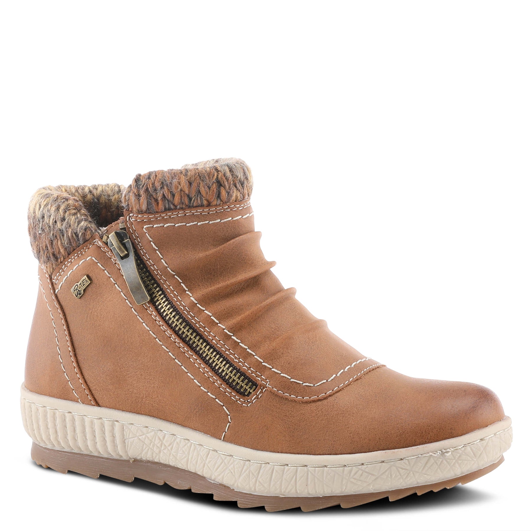 Experience the comfort revolution in this water resistant manmade leather pull-on bootie featuring a pleated vamp and a dual zipper design all on a traditional rubber wedge outsole.
