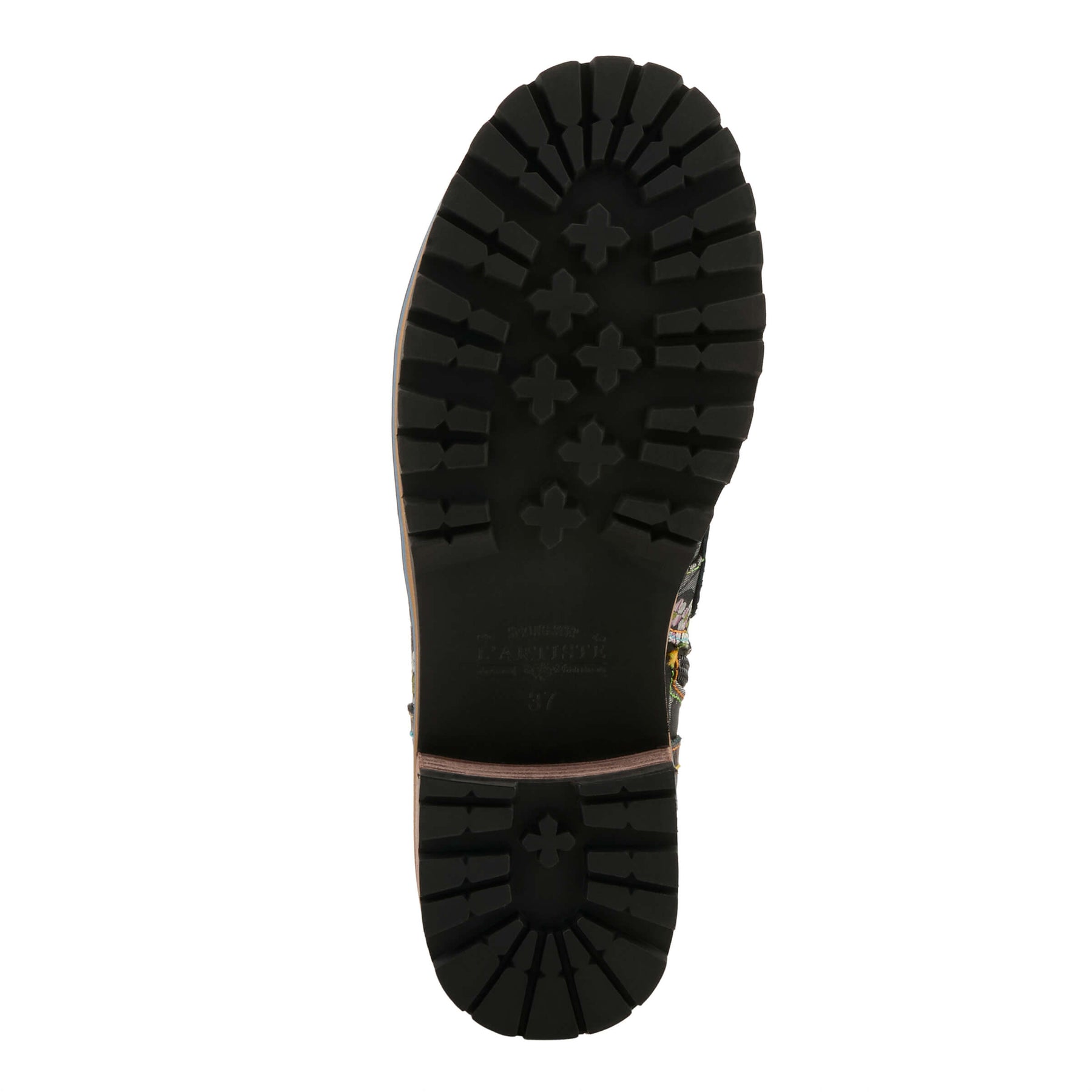 Incredible leather combination bootie showing an embroidered textile and embossed floral leather on a comfort lug sole.