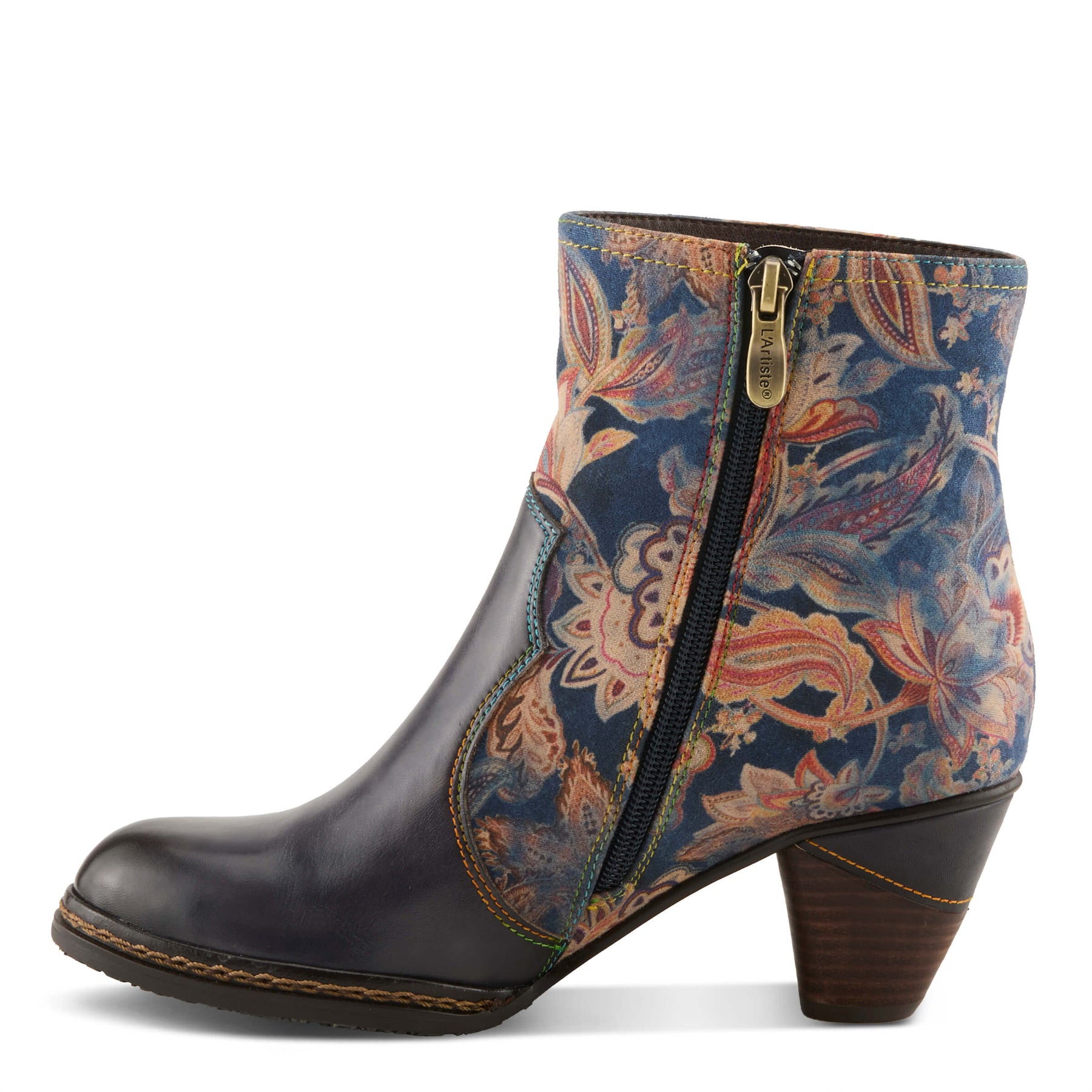L`ARTISTE Style: NAIMA Step into effortless elegance with this stunning ankle boot, where artistry meets modern fashion. Crafted with a luxurious leather combo upper, it features a bold contrast of smooth and floral-printed panels, accentuated by an intricate cutout rose embellishment. A stacked mid-heel offers the perfect balance of height and stability, while the cushioned insole ensures all-day comfort. Designed with an inside zip for easy wear, this boot seamlessly blends chic sophistication with contemporary flair. Whether you''re dressing up or adding an artsy touch to everyday wear, this standout piece is a must-have for trendsetters. Upper: Textile Lining: Faux Fur Insole: Faux Leather Outsole: Rubber Closure: Zipper Heel Height: 2 1/4" Shaft Height: 7" Circumference: 10" Features: - Leather Combo Upper – A unique mix of smooth leather and floral-printed panels. - Artistic Cutout Rose Detail – Adds a statement-making, feminine touch. - Inside Zip Closure – Hassle-free on-and-off wear. - Cushioned Insole – Designed for supreme comfort and support. - Fits true to size.