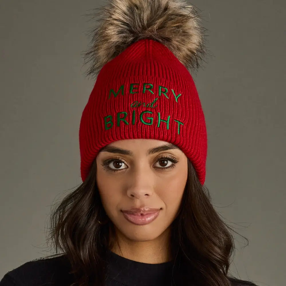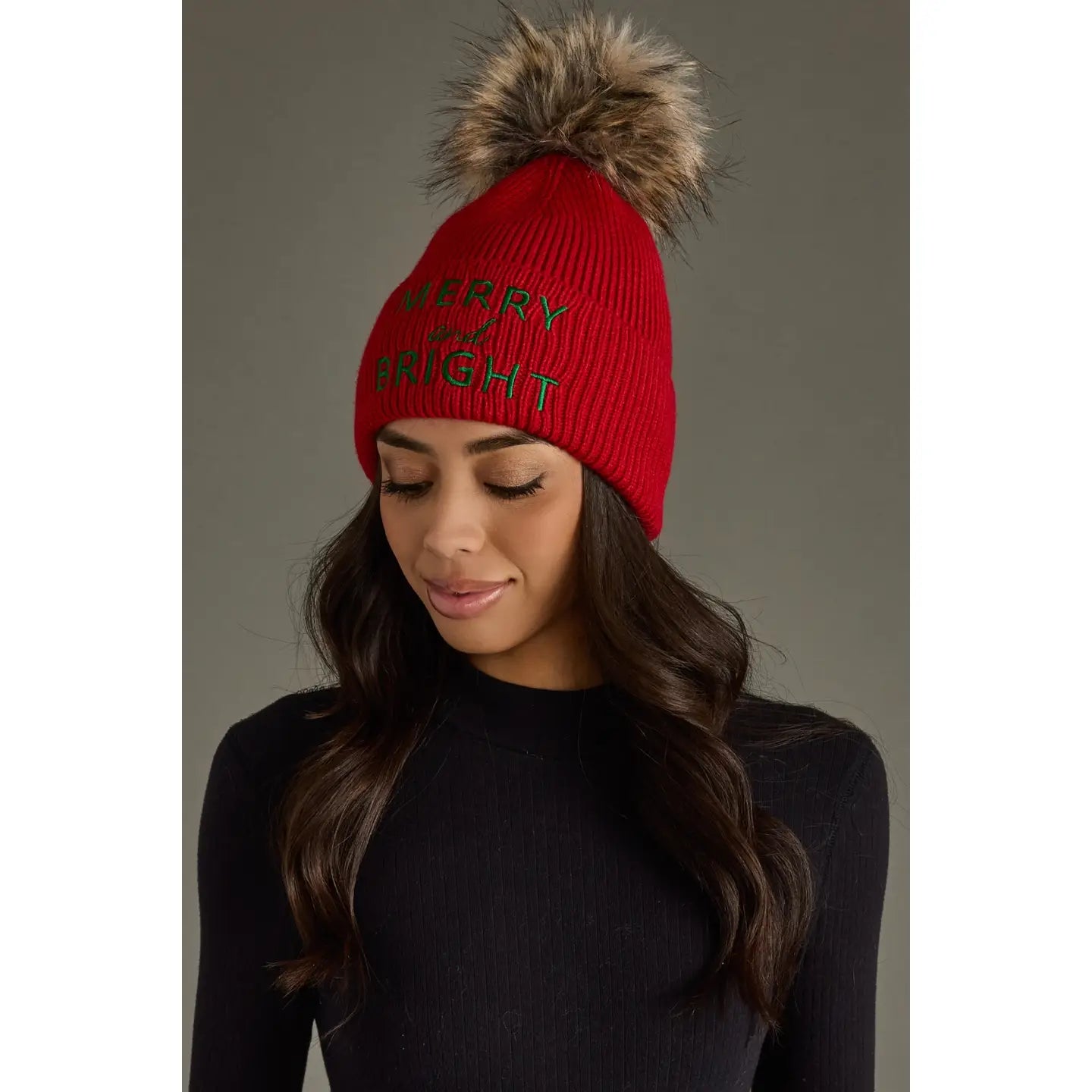 Red knit pom hat Green embroidered "Merry and Bright" on the cuff Natural faux fur pom accent Fleece lined 100% Acrylic