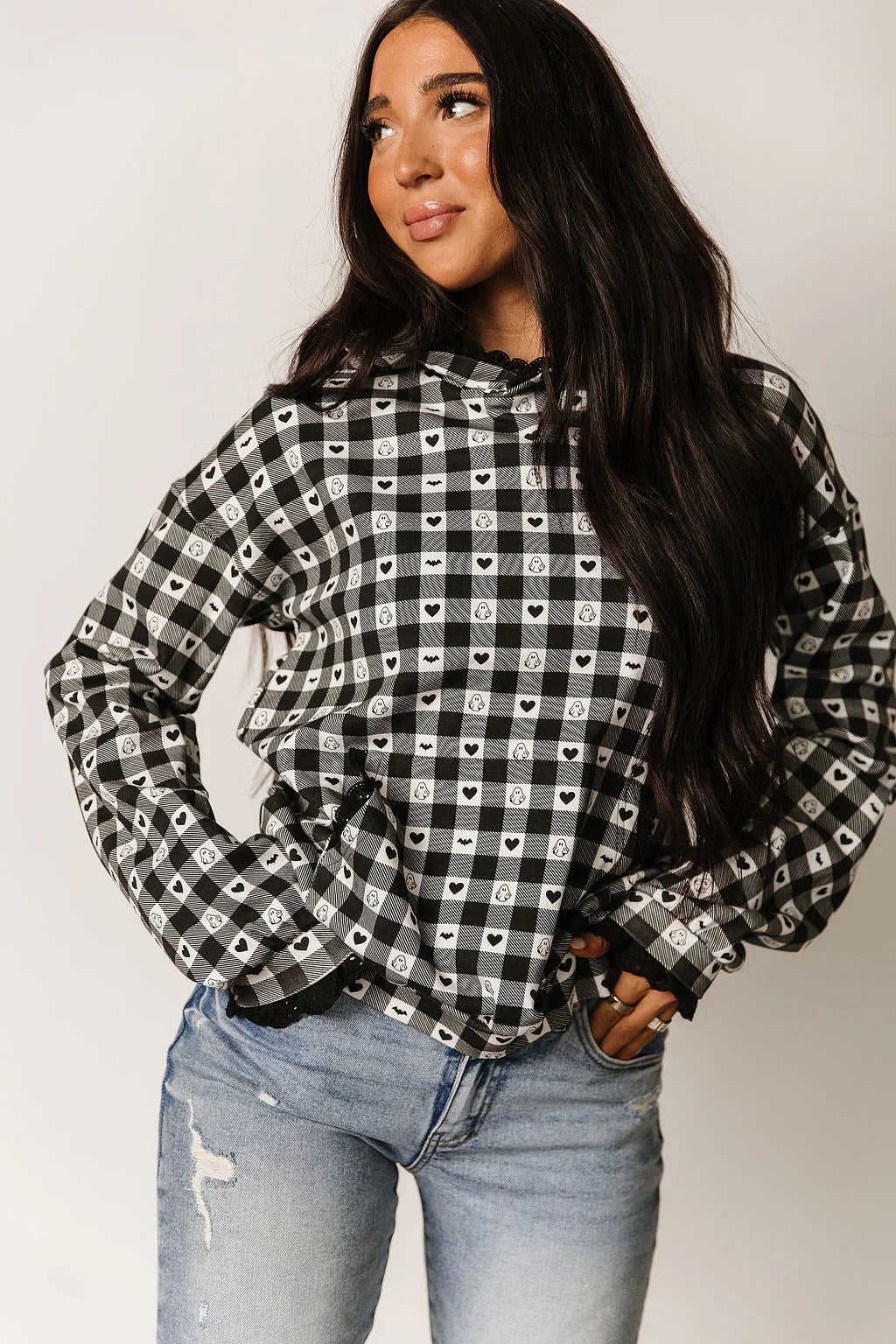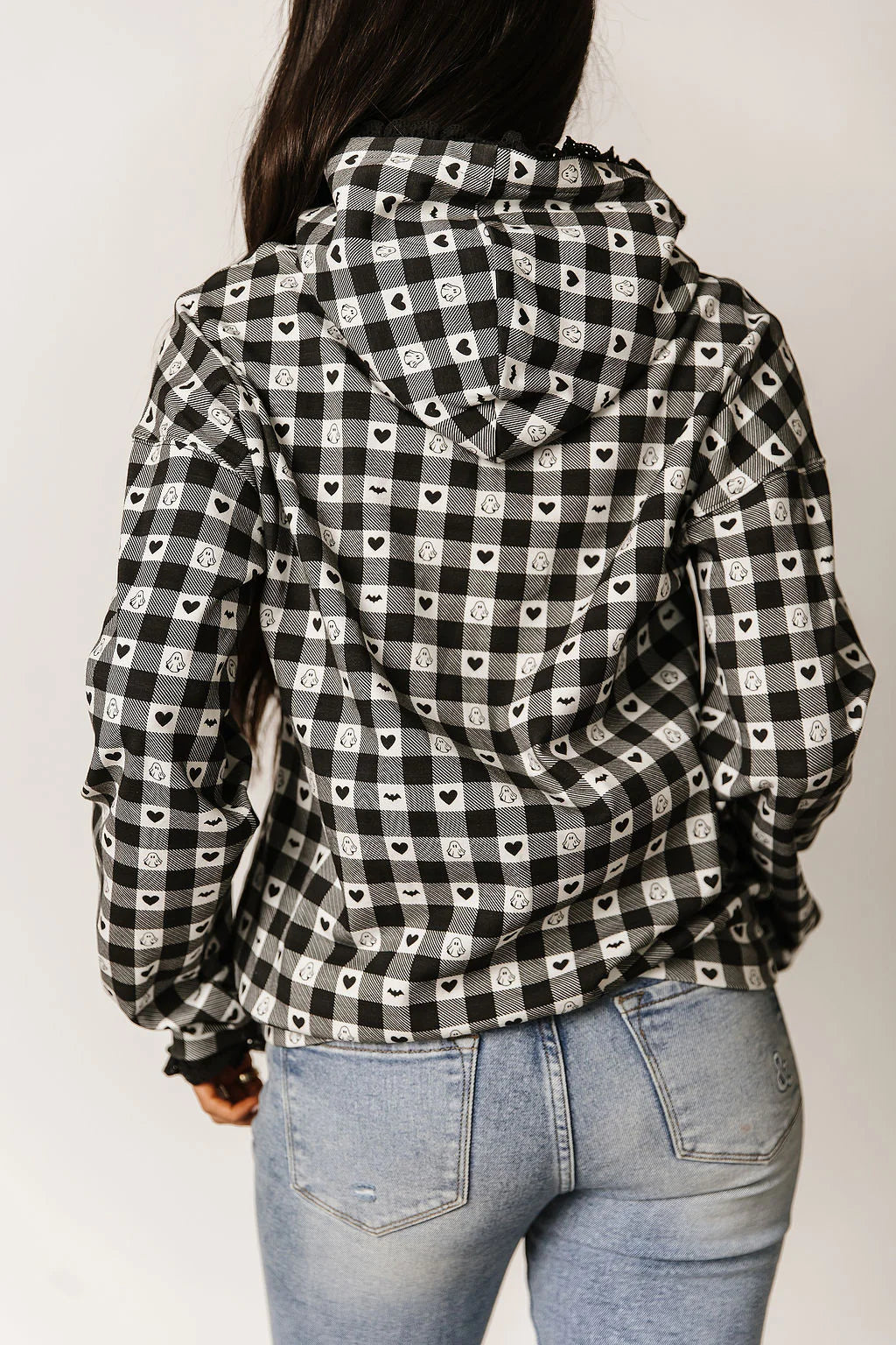 A little spooky and a whole lotta’ cute! Hearts, bats, cute ghosts and a checkered print give you all the sweet Halloween vibes you could ask for. Features: Triple Stretch Fabric University Fit (a little wider & shorter) Lace Trim Sleeves & Hood Kangaroo Pocket No Drawstrings 95% Cotton, 5% Spandex Model is wearing a size small