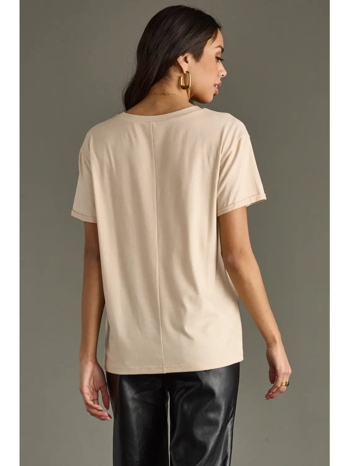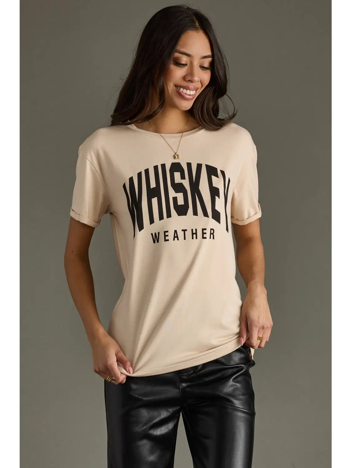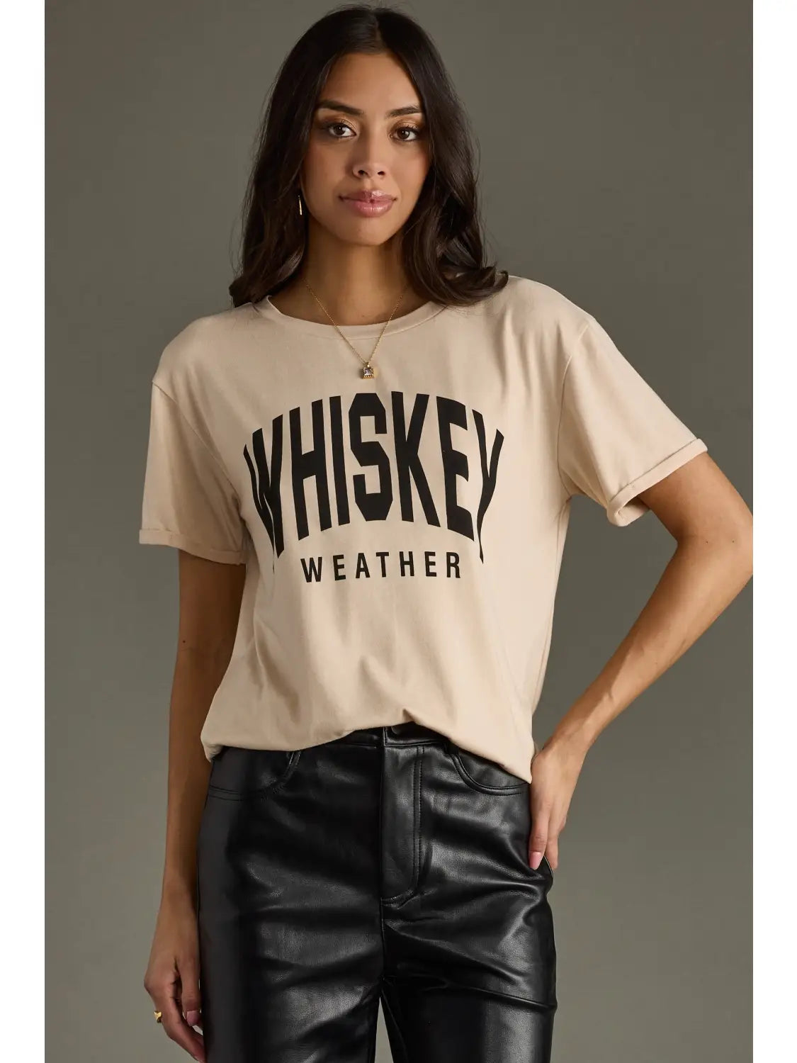 Tan graphic tee Black "Whiskey Weather" text on the front 60% Polyester / 35% Rayon / 5% Spandex