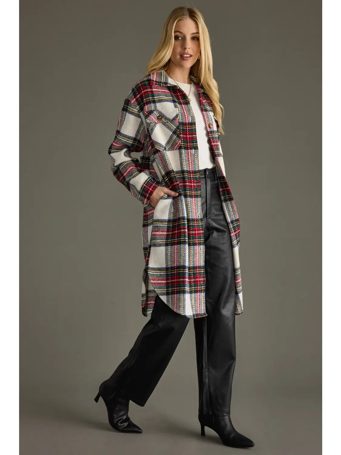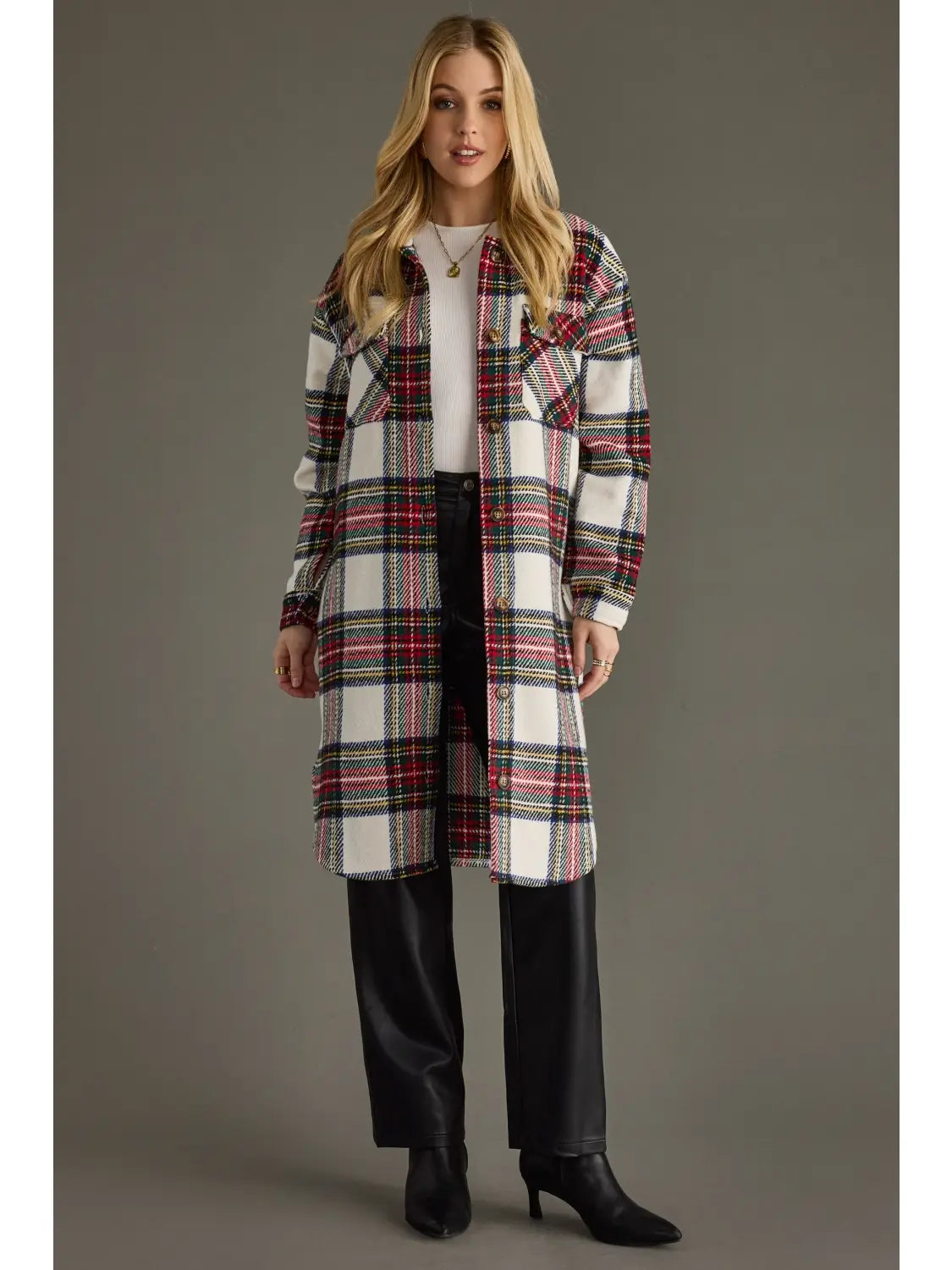 Ivory & multicolored plaid long shacket Button closure Two side pockets 100% Polyester