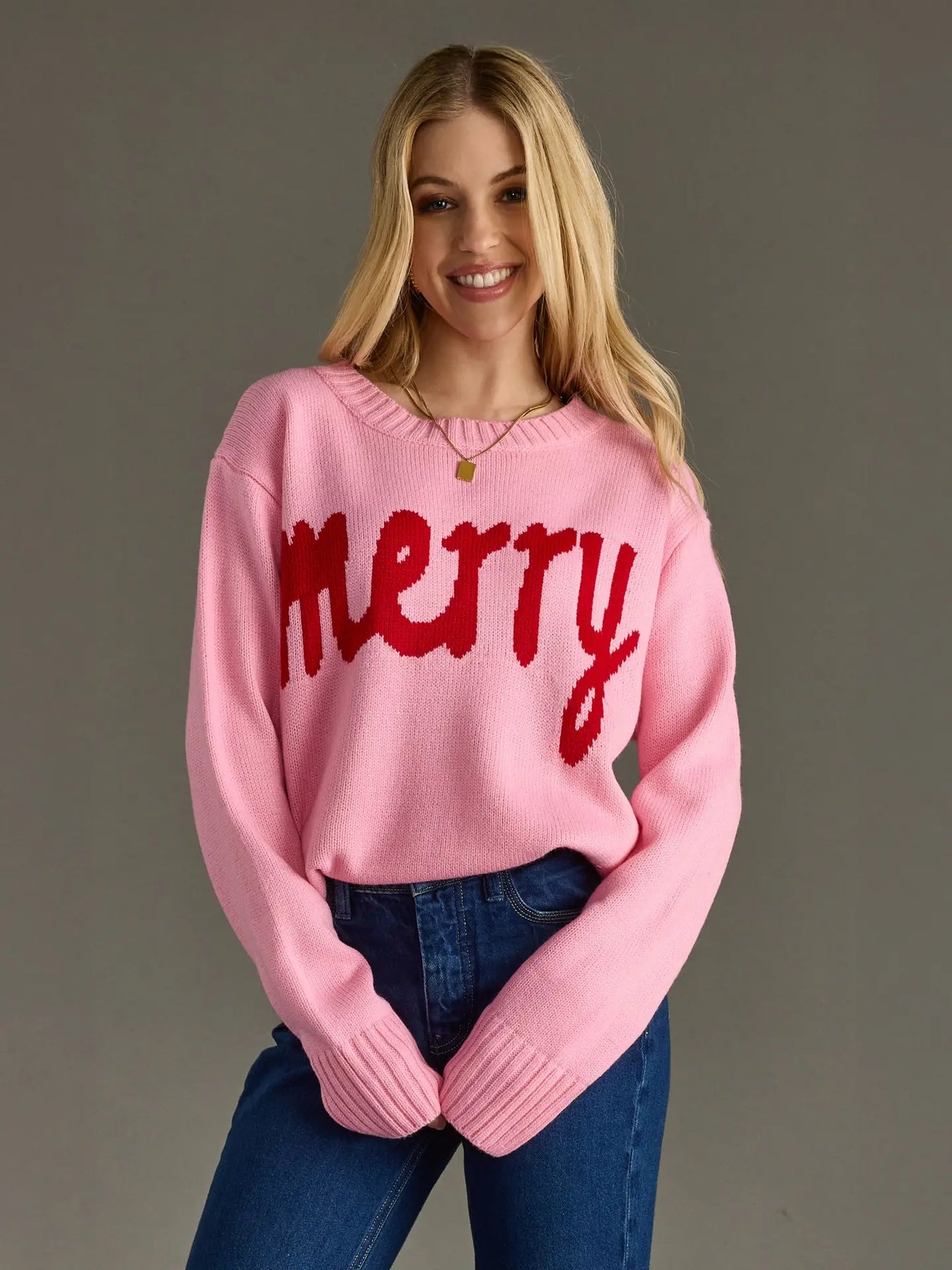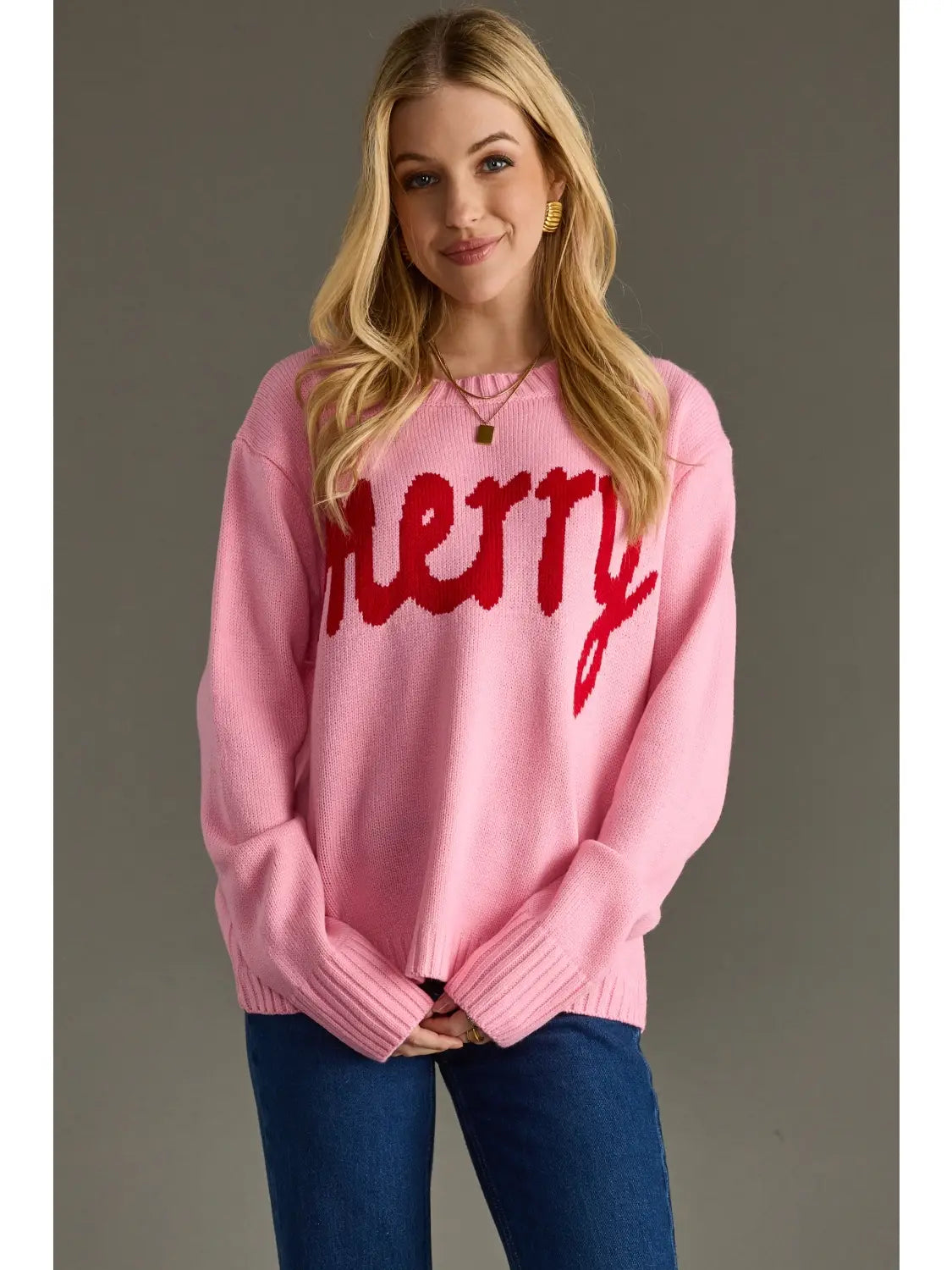 Pink knit sweater Red "Merry" text on the front 100% Acrylic