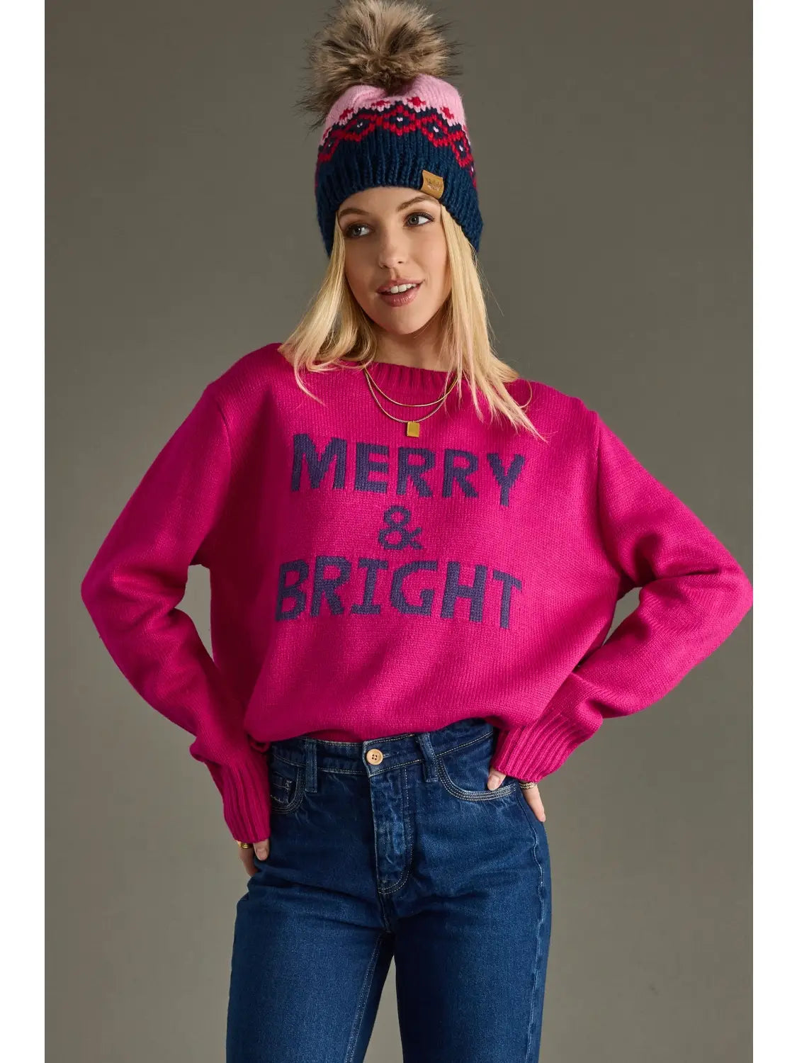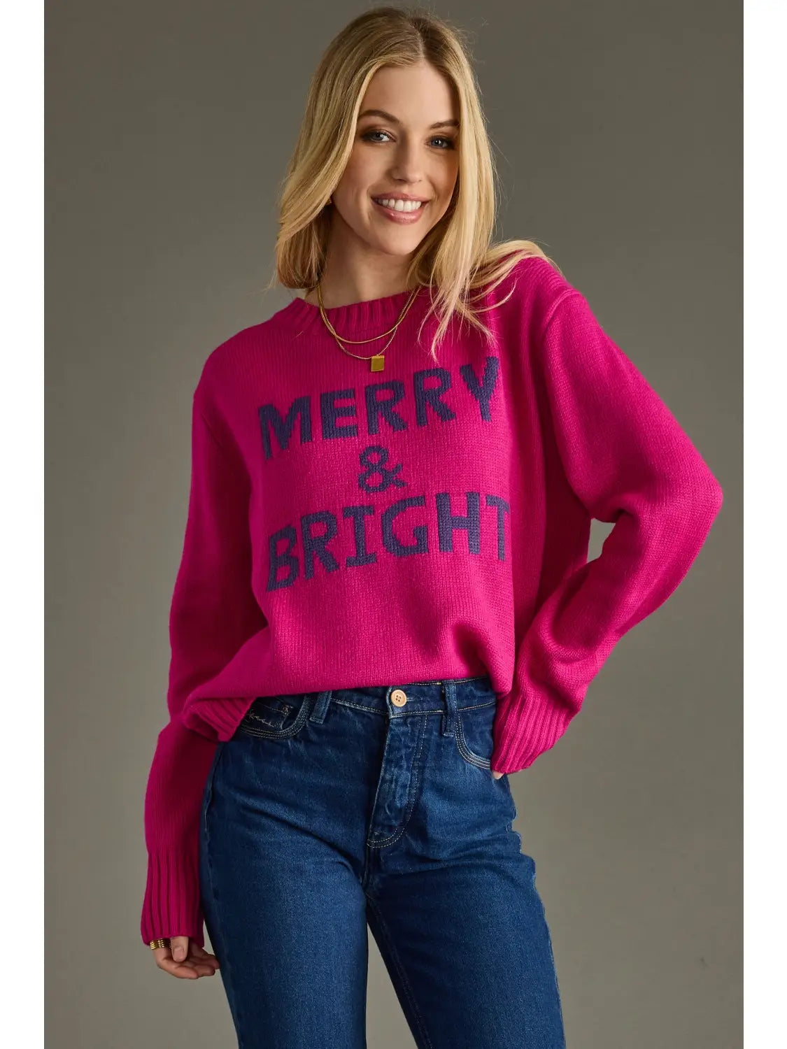 Magenta knit sweater Periwinkle "Merry & Bright" text on the front 100% Acrylic