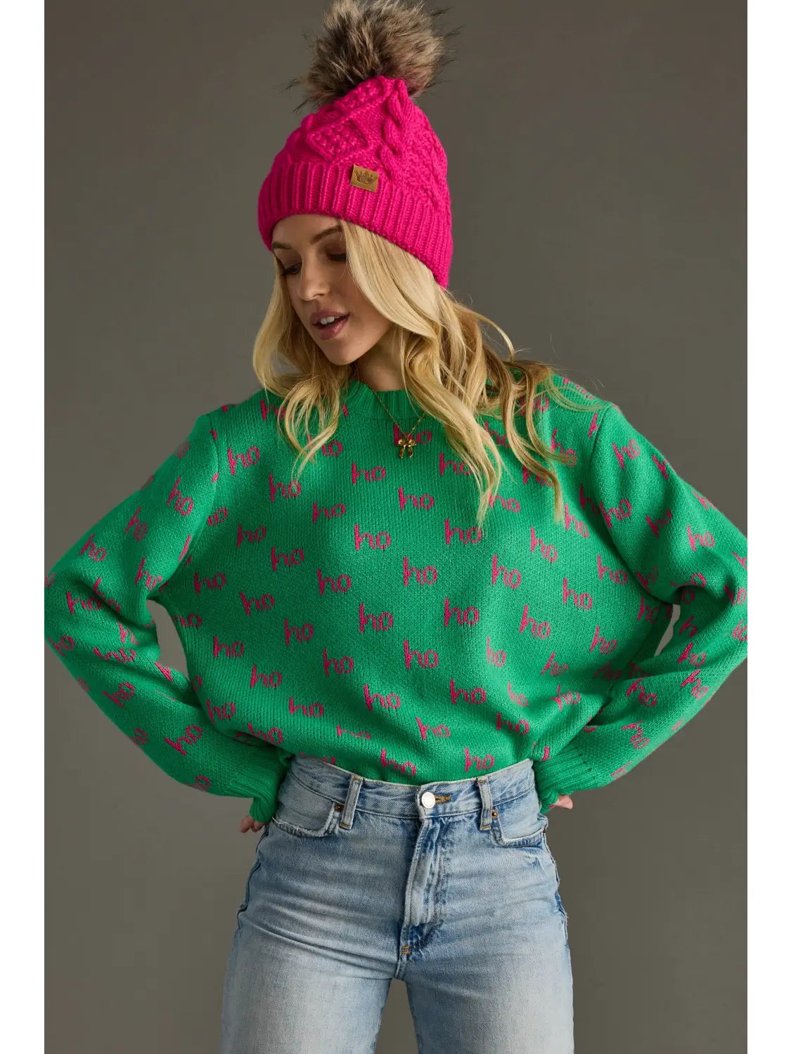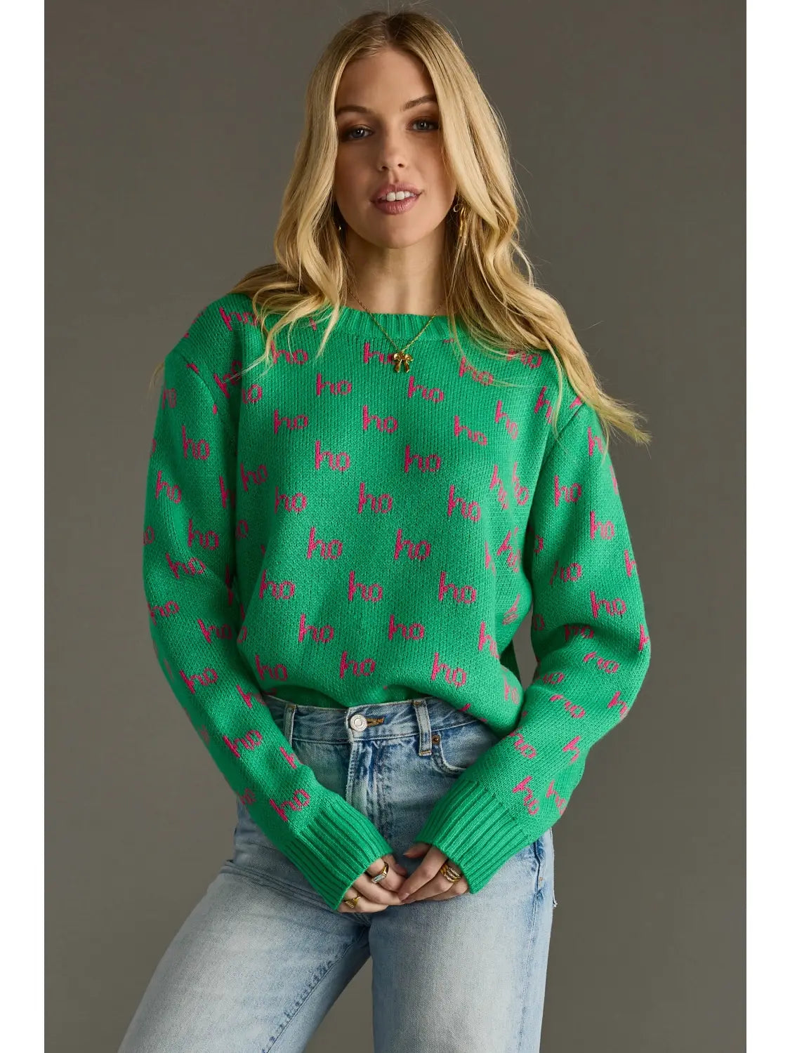 Green knit sweater Pink "ho ho ho" text on the front 100% Acrylic