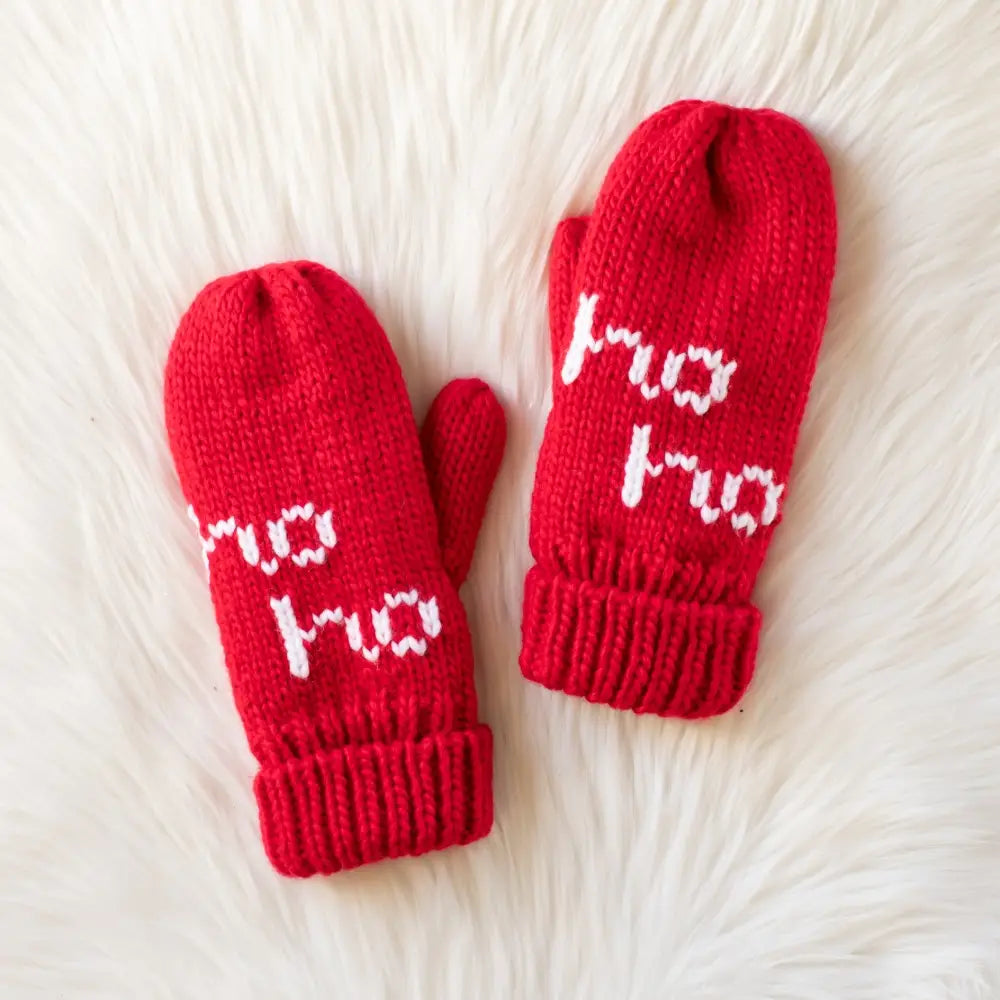 Red knit mittens Pairs with matching hat H-816 White "ho ho ho" text Fleece lined 100% Acrylic